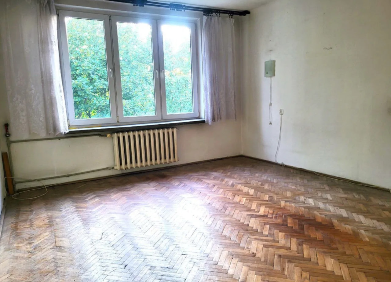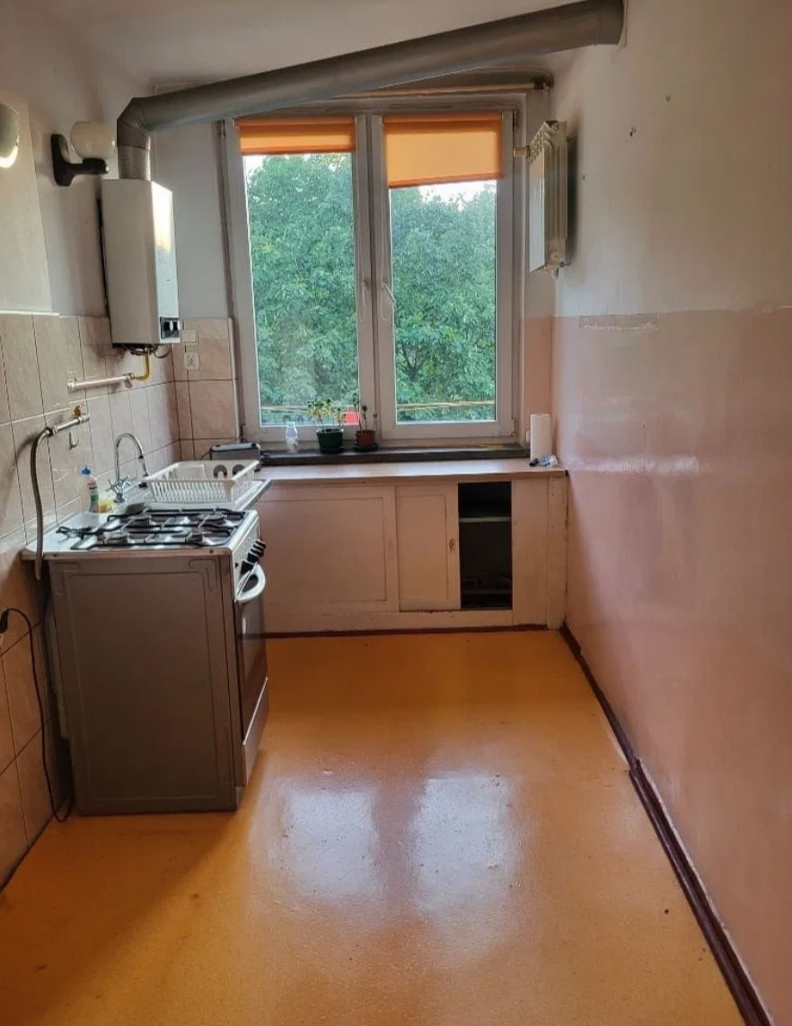 Mieszkanie z lat 90. Nieodnawiane od dekady. Stara instalacja, zużyte podłogi, przestarzała kuchnia i łazienka.